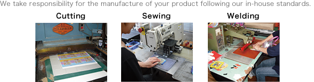 Various products are processed as needed for manufacturing at our own factory and in cooperation with factories both in Japan and abroad. Notably, our factory in Yao City is capable of full manufacturing services, with the exception of printing. We can flexibly handle even the most difficult manufacturing processes. We also provide a full range of planning and production services.